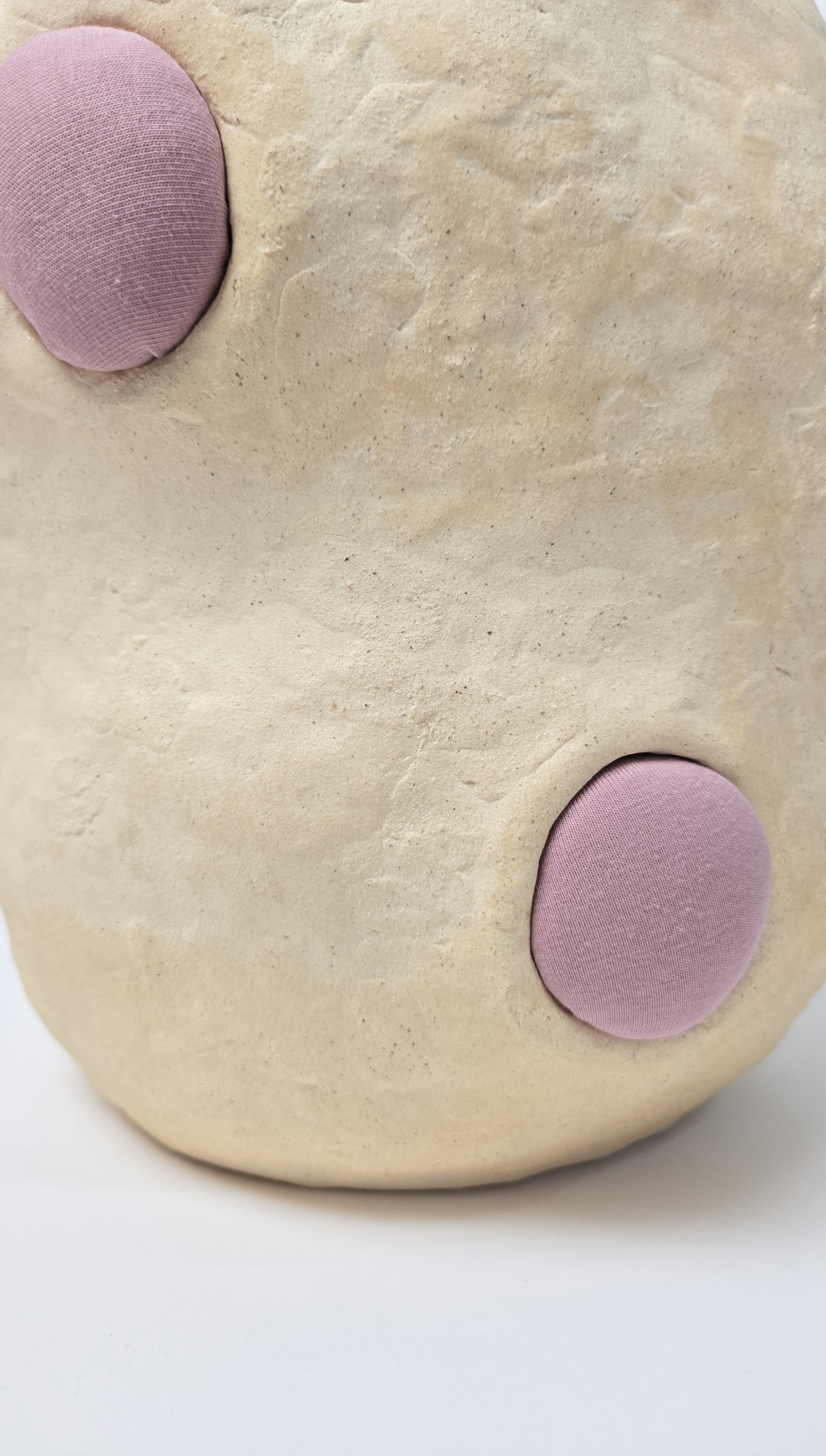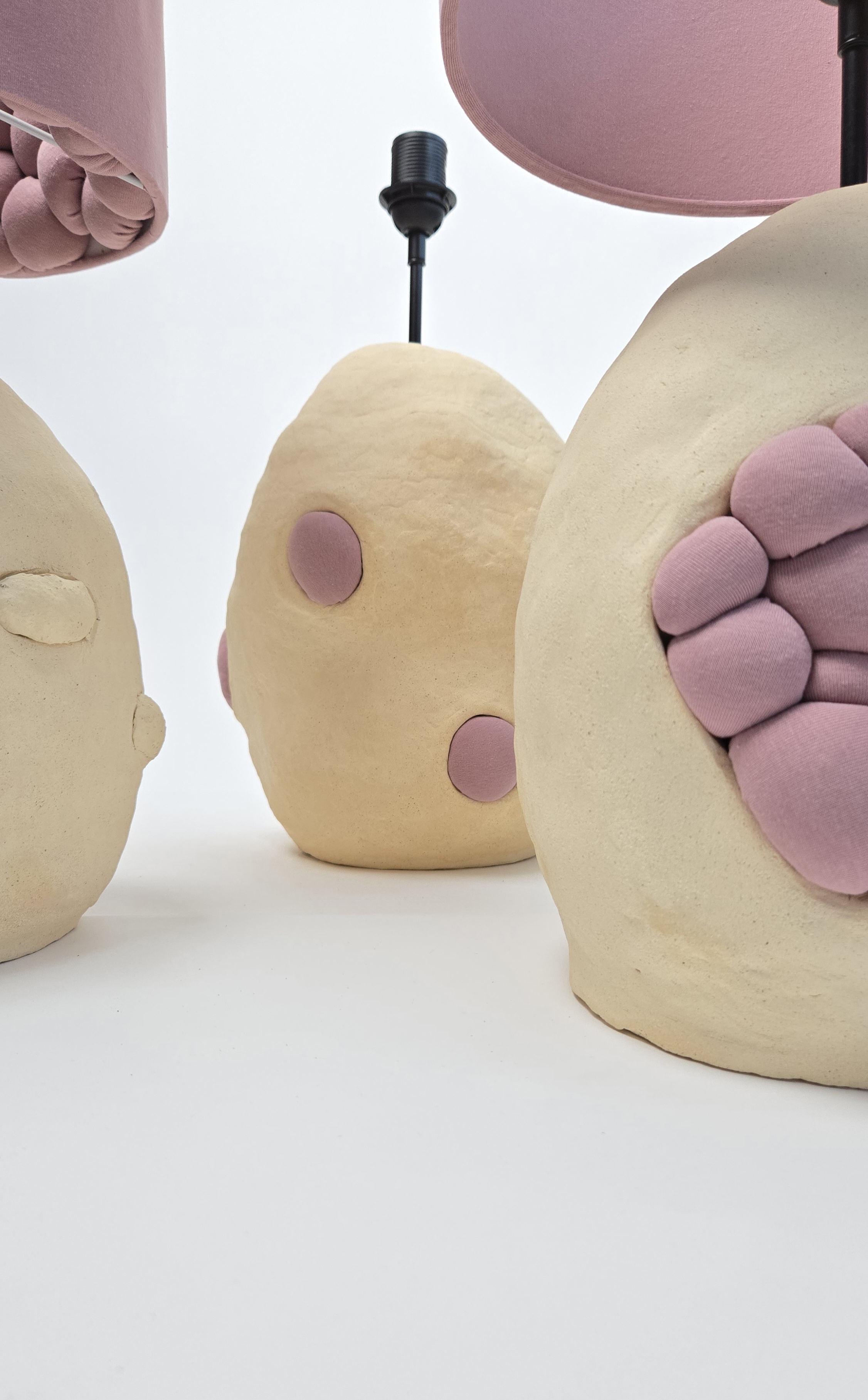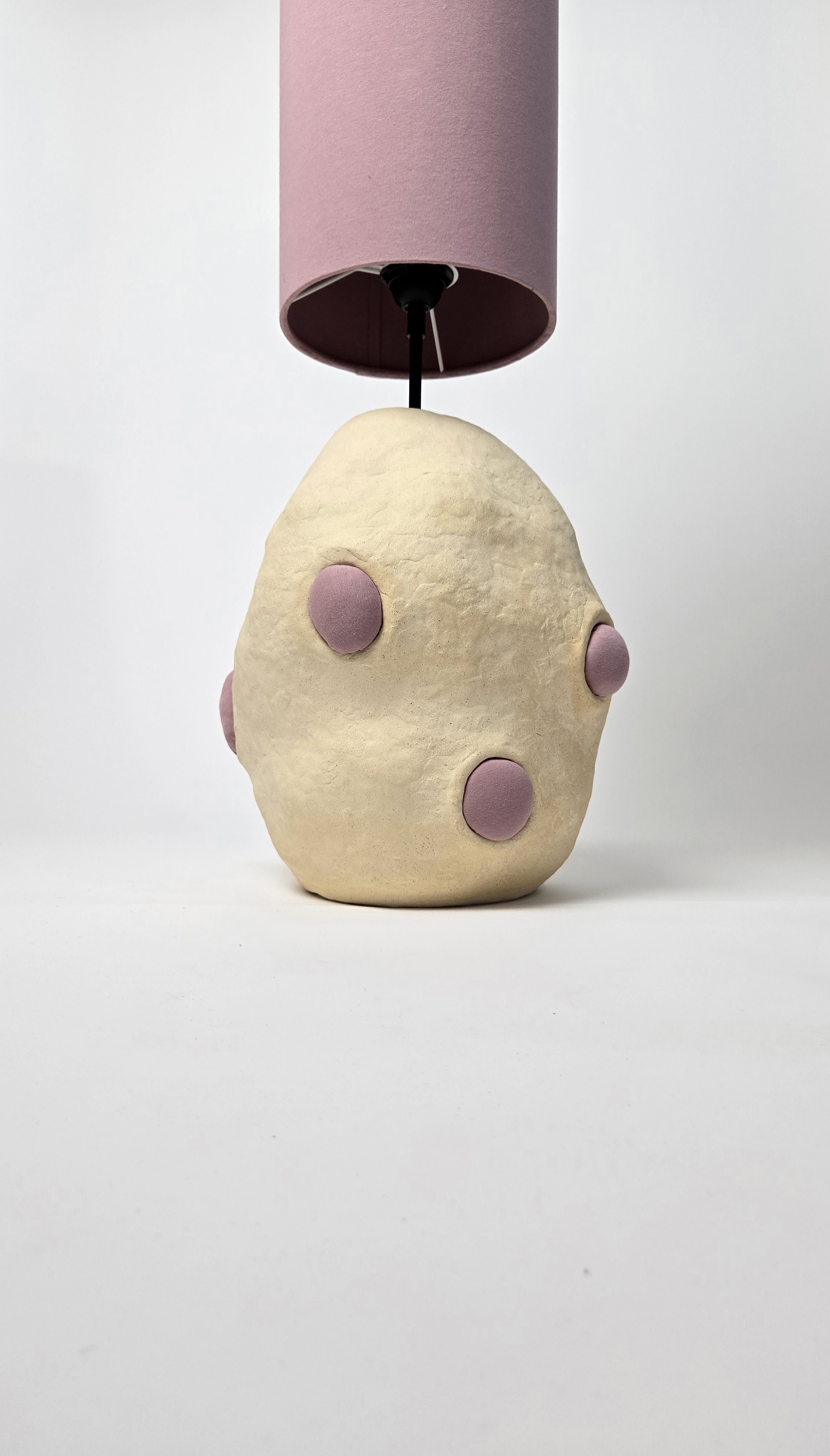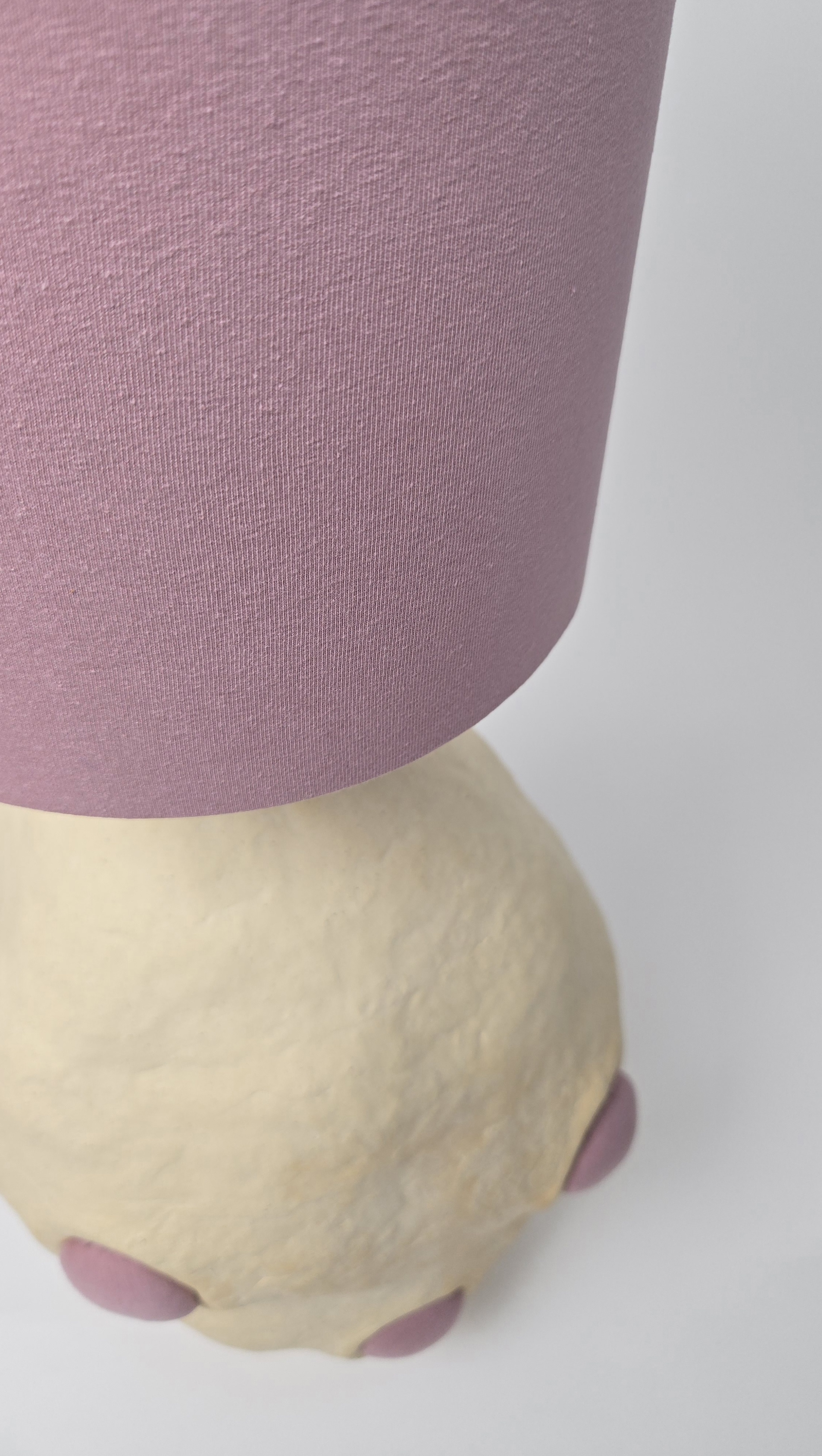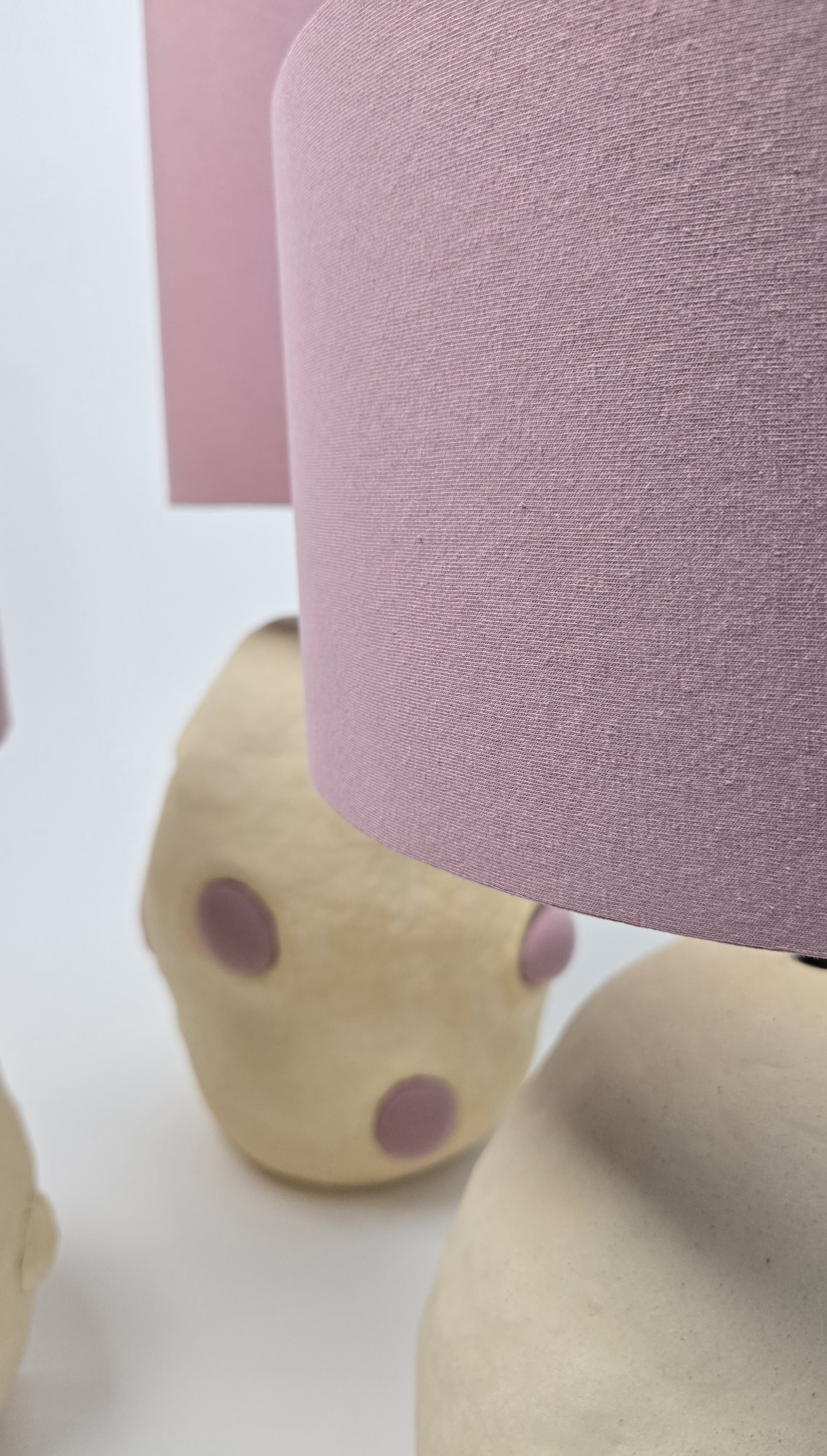 Stolní lampa s ručně tvarovaným keramických podstavcem a vsazenými textilními prvky. Doplněna jednoduchým válcovým stínidlem.