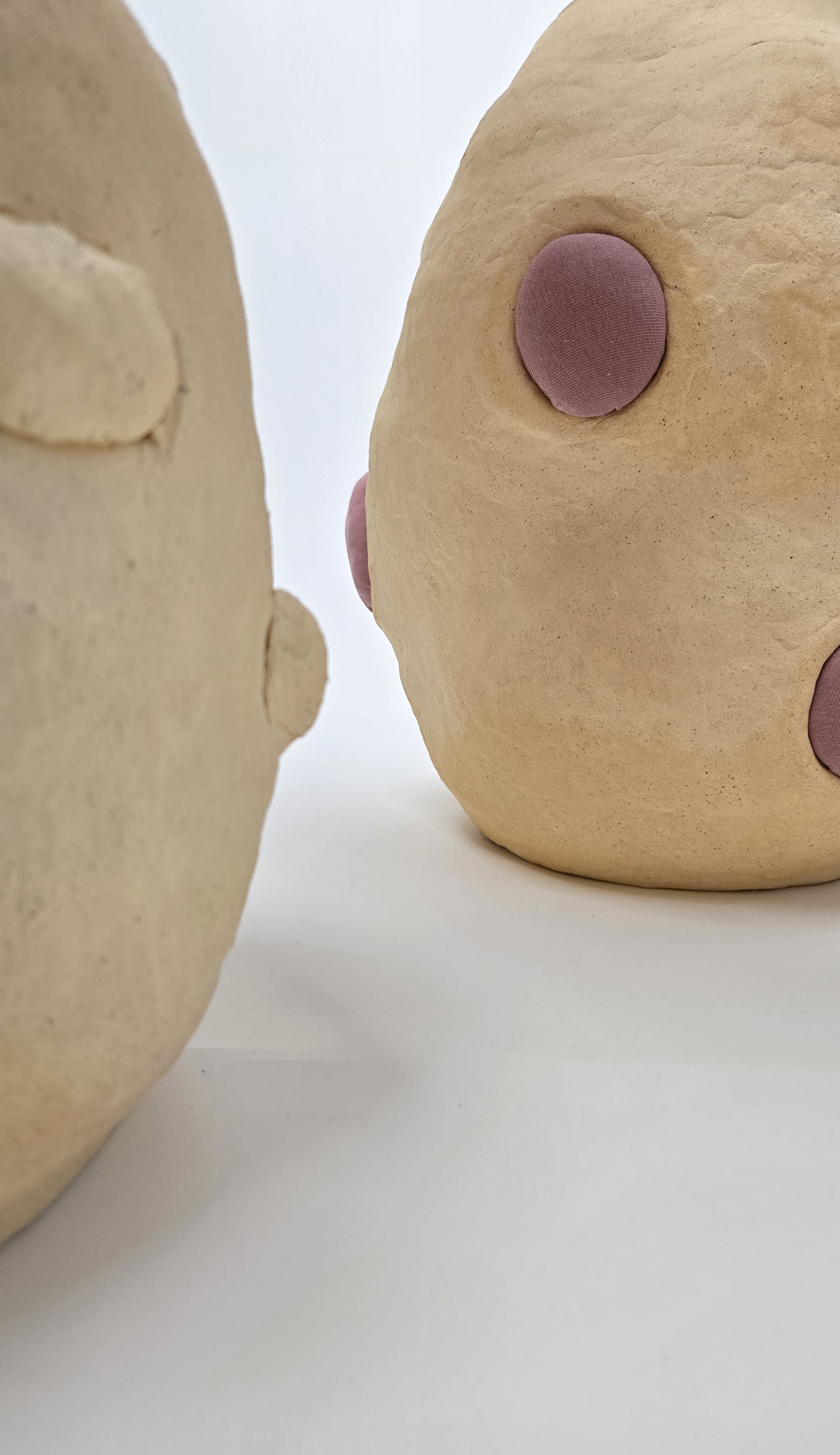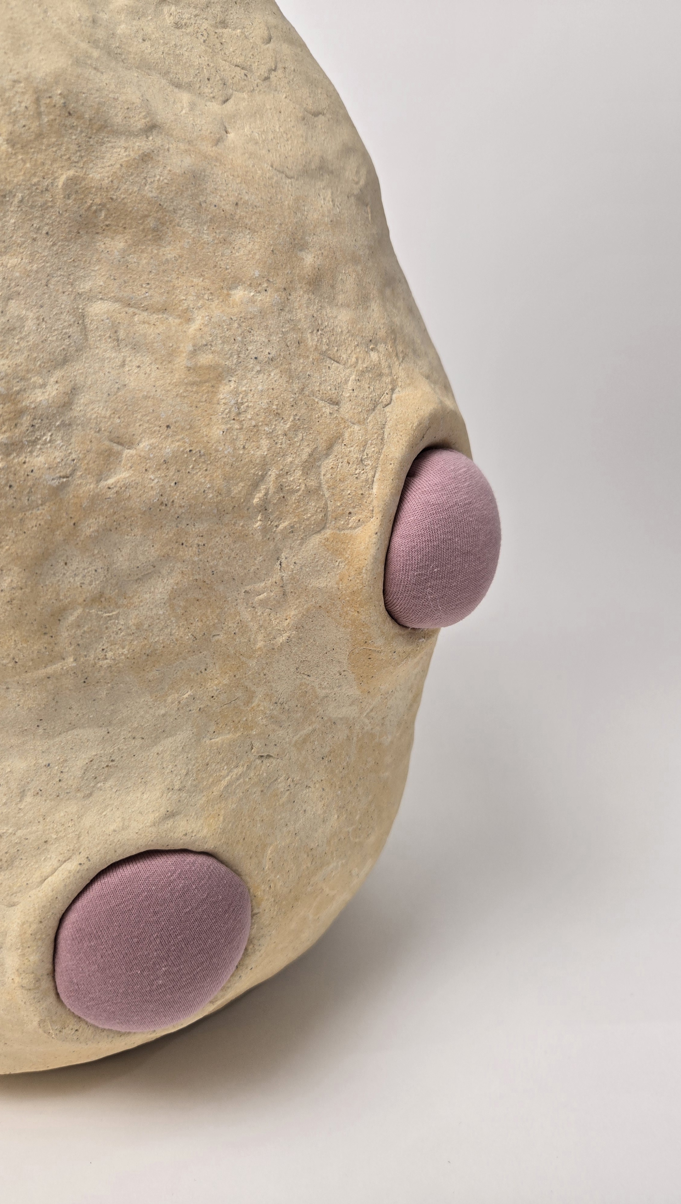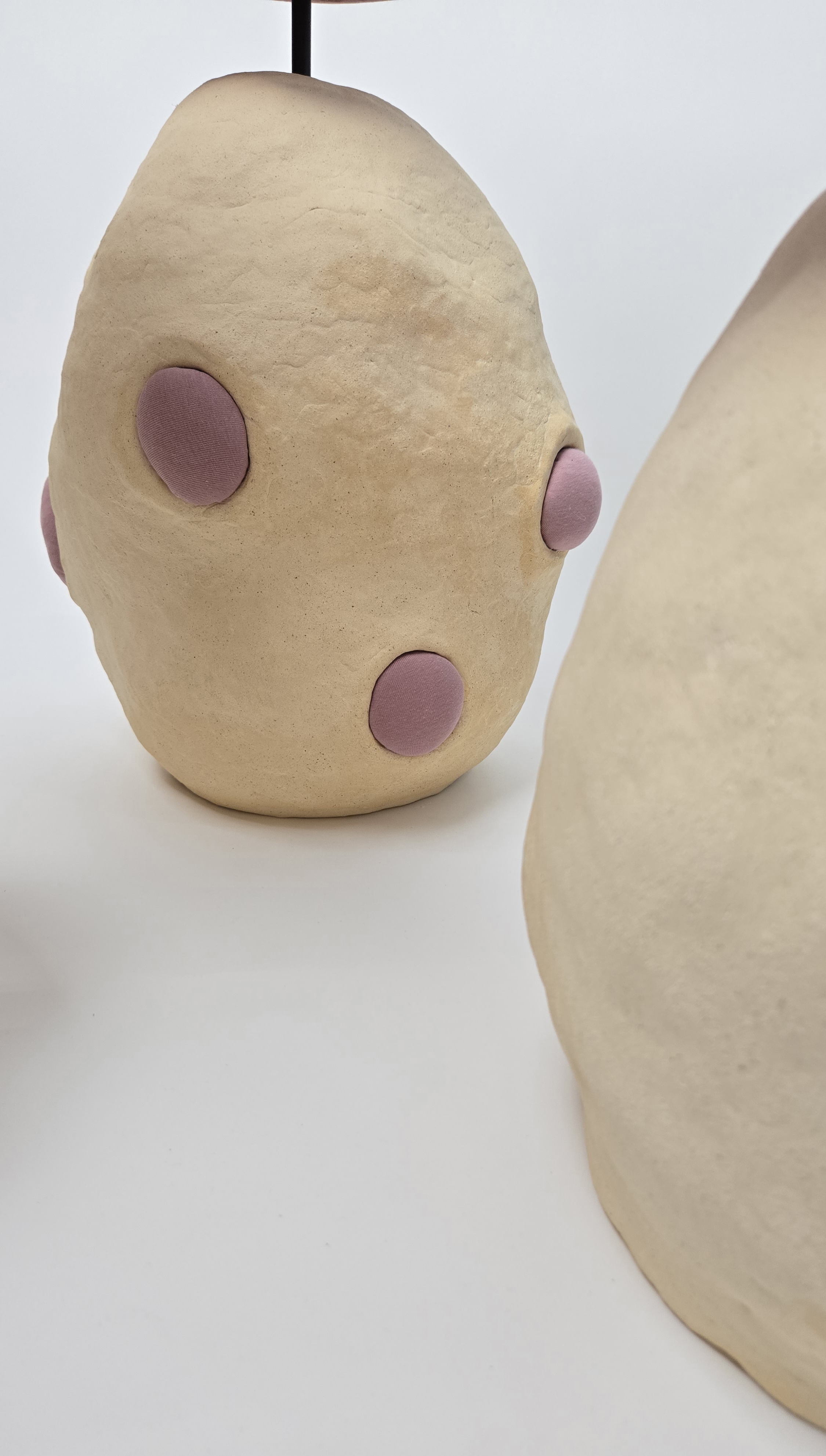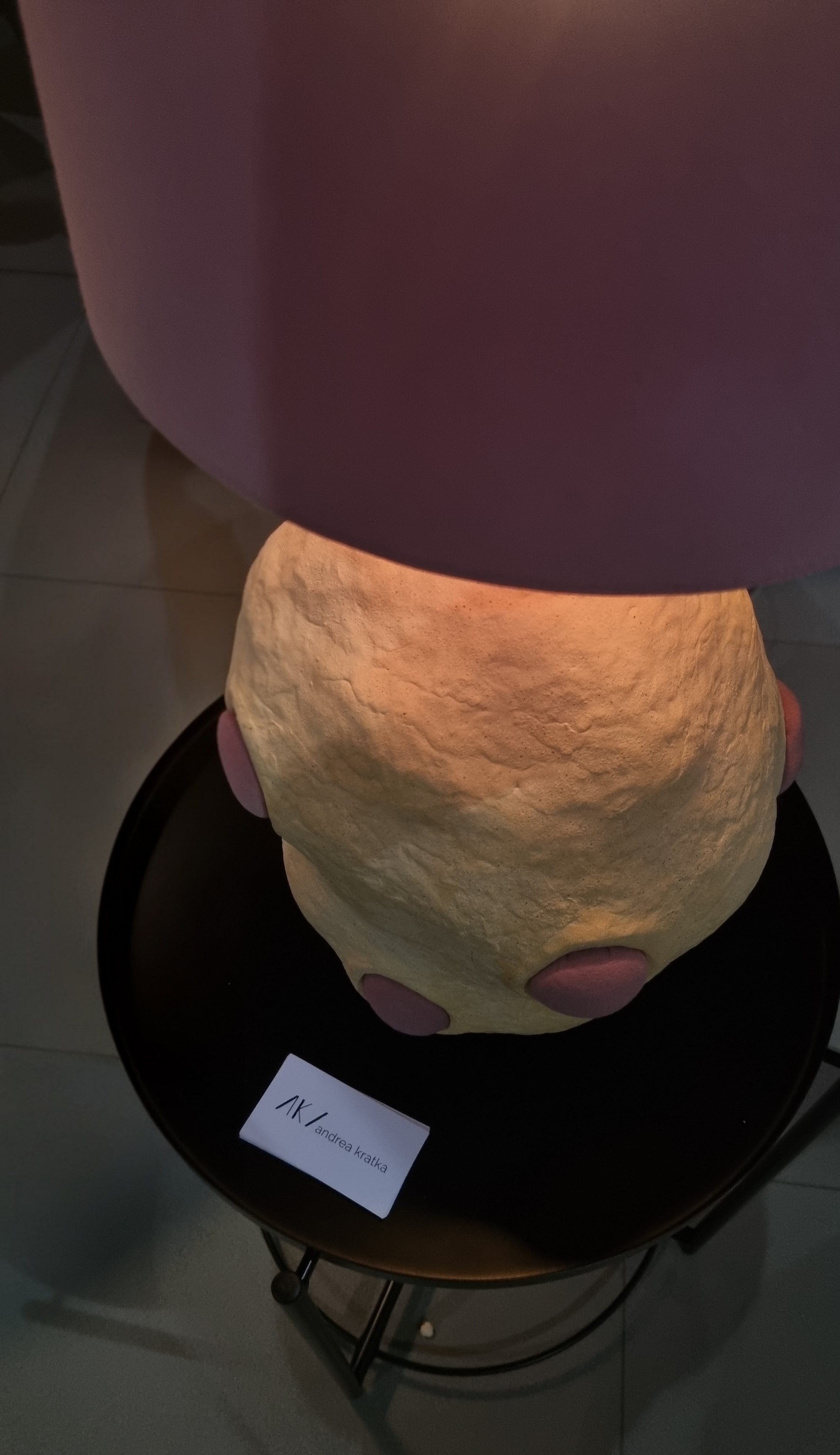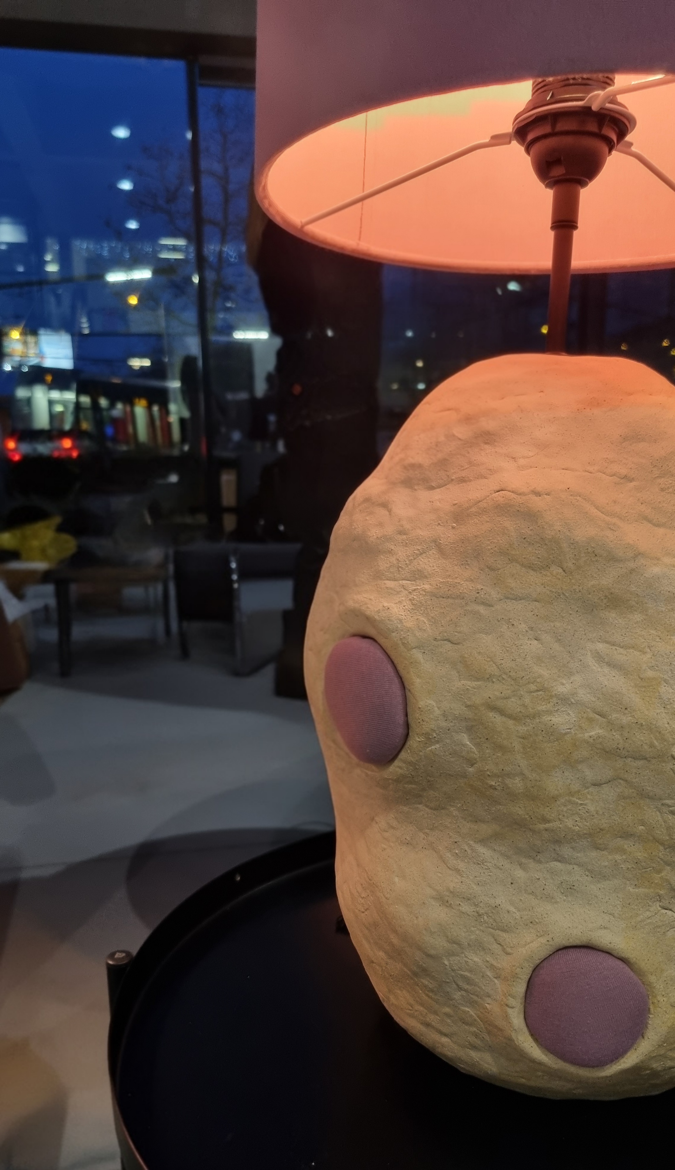 Stolní lampa s ručně tvarovaným keramických podstavcem a vsazenými textilními prvky. Doplněna jednoduchým válcovým stínidlem.