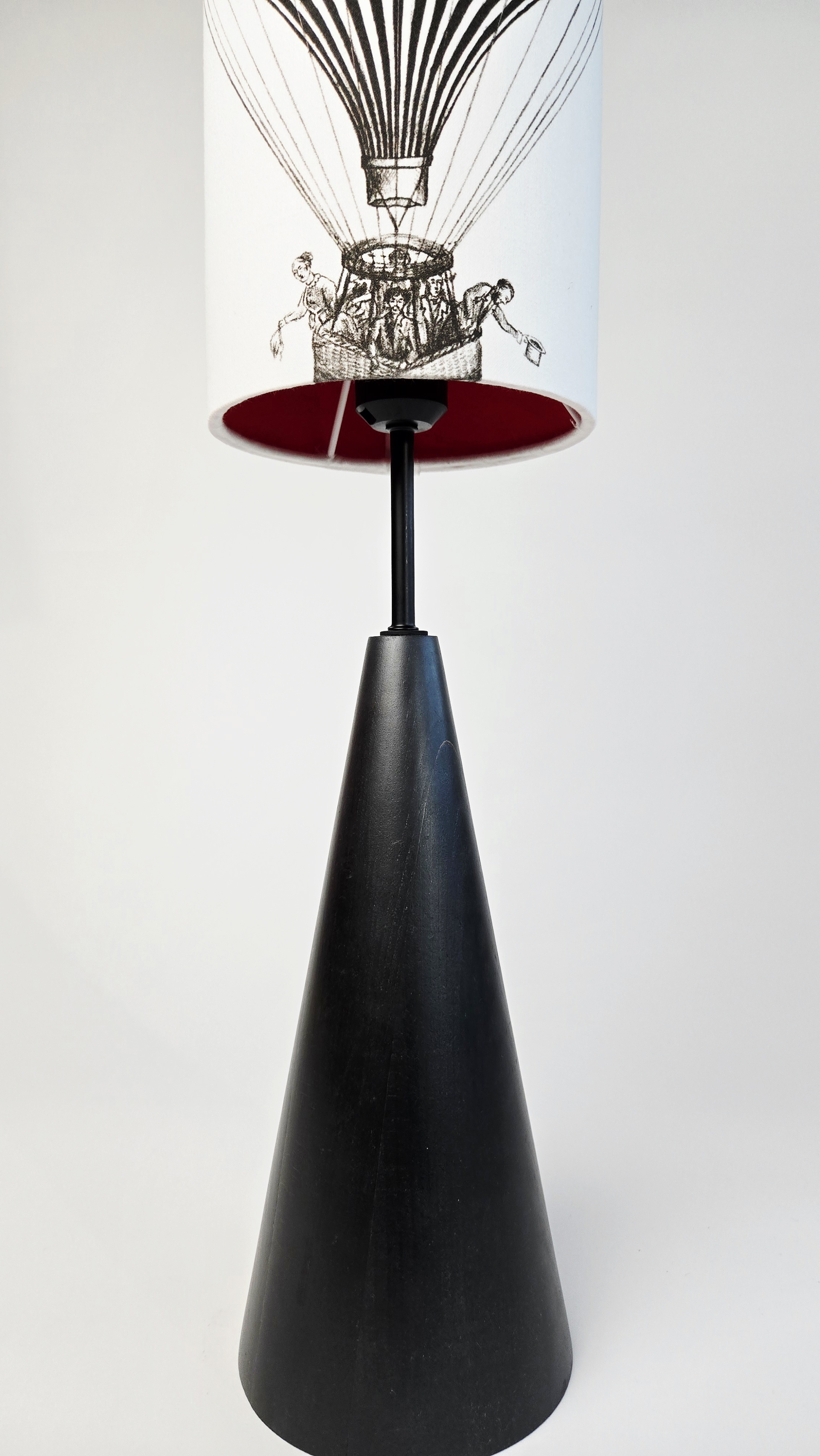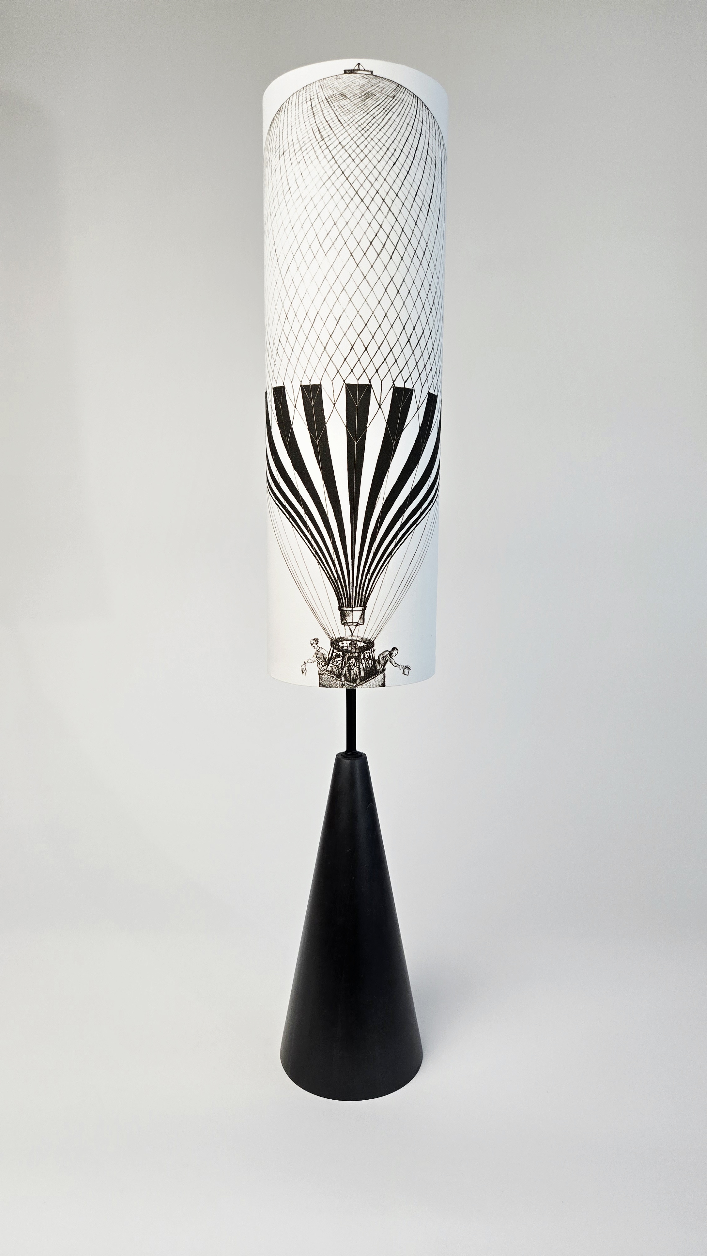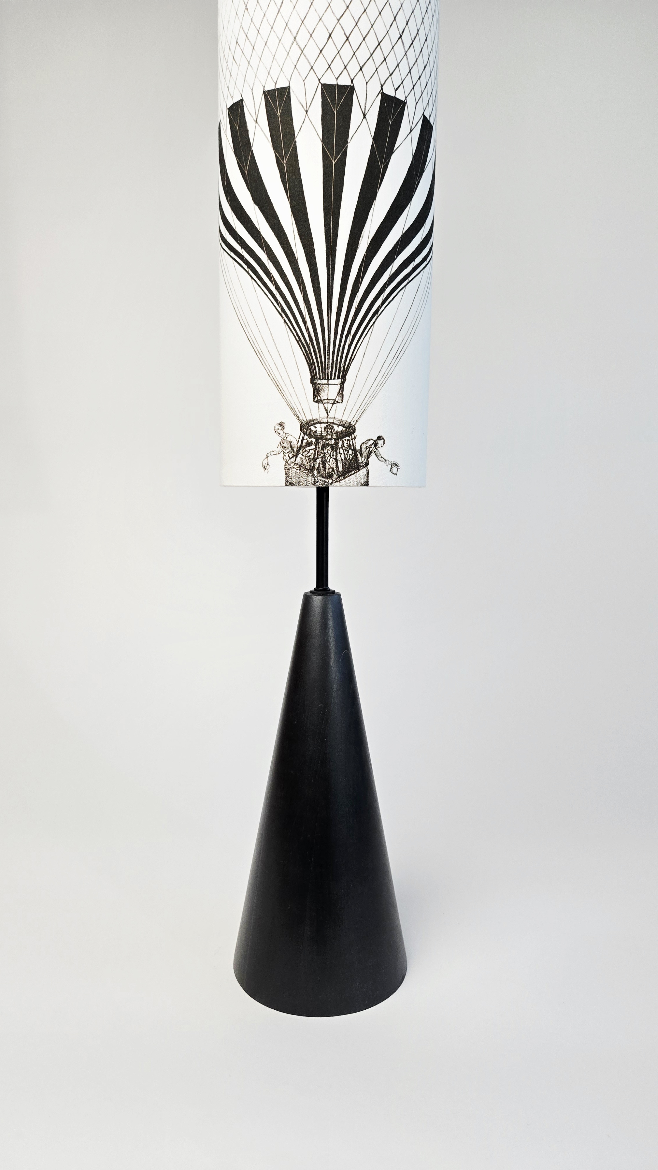 Minimalistický černý podstavec z bukového dřeva doplněný černobílou kresbou horkovzdušného balónu