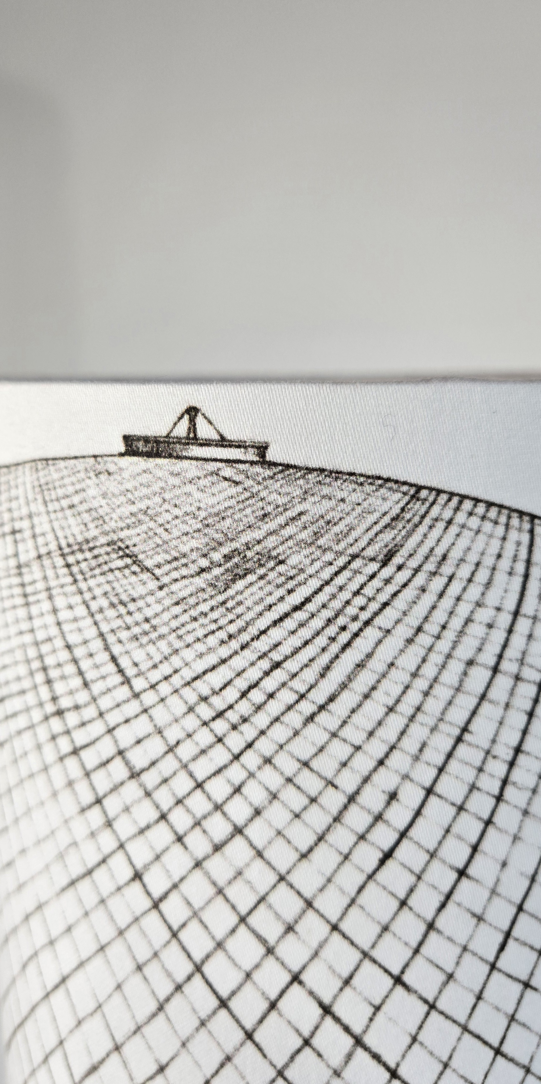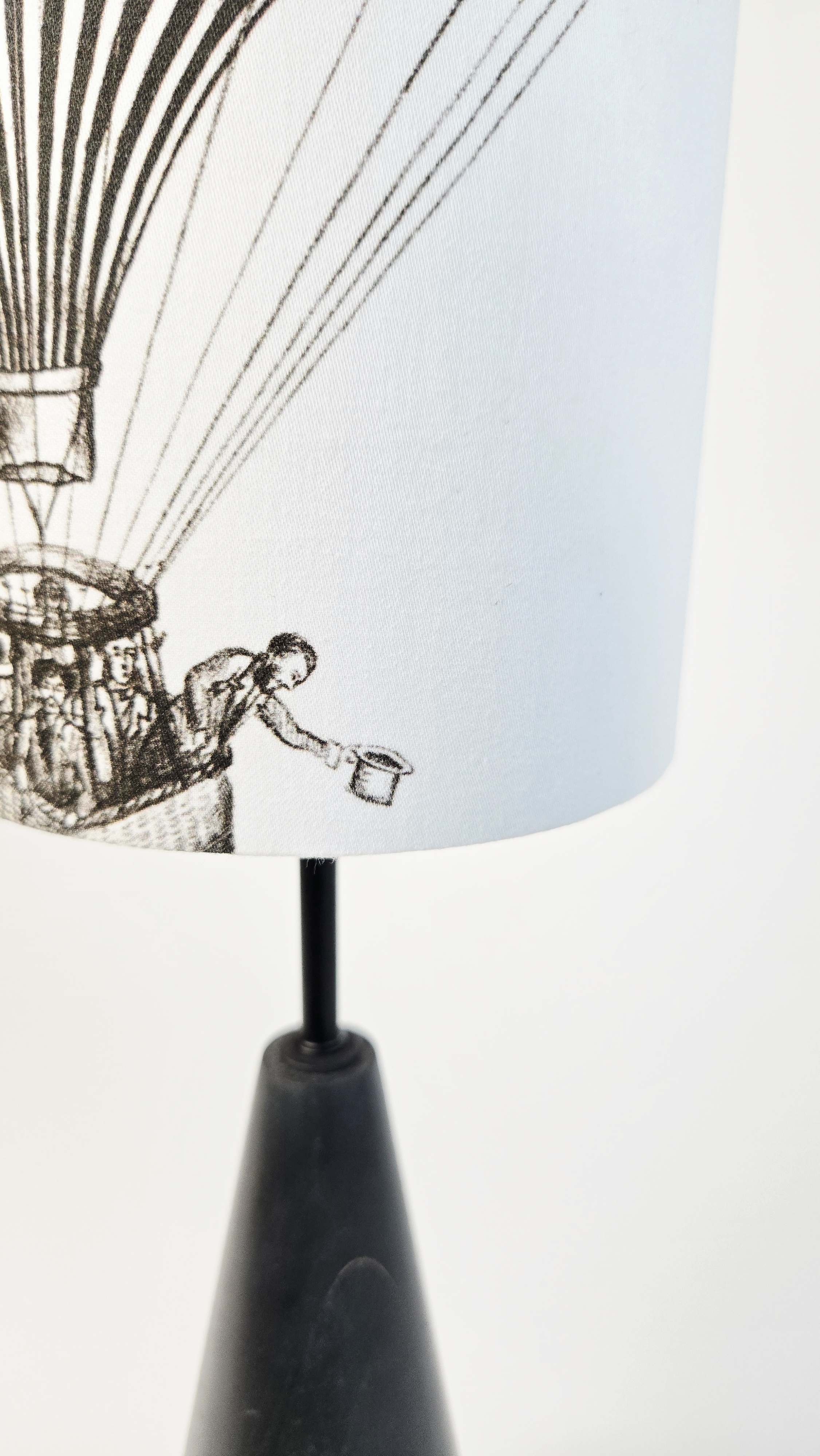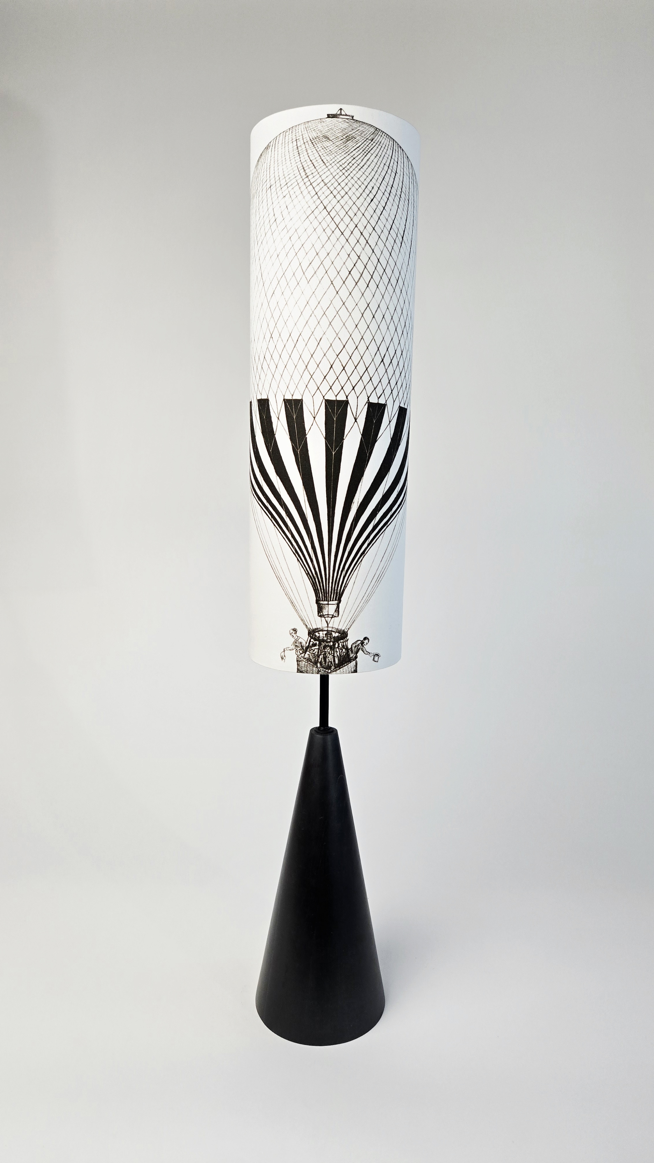 Minimalistický černý podstavec z bukového dřeva doplněný černobílou kresbou horkovzdušného balónu