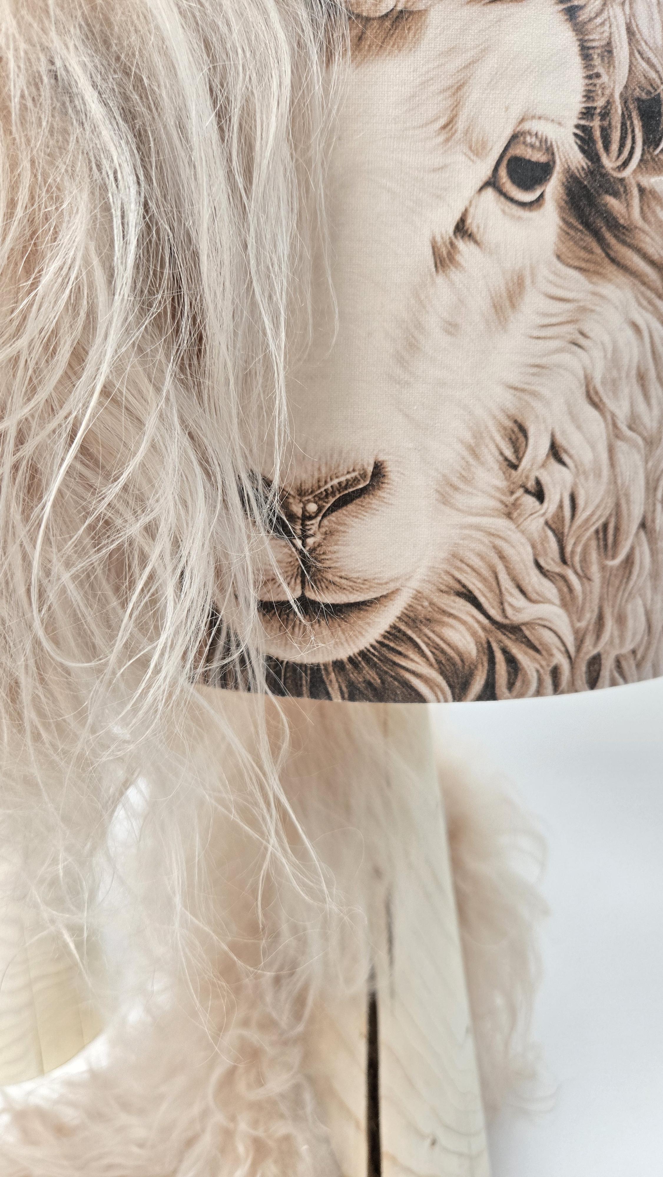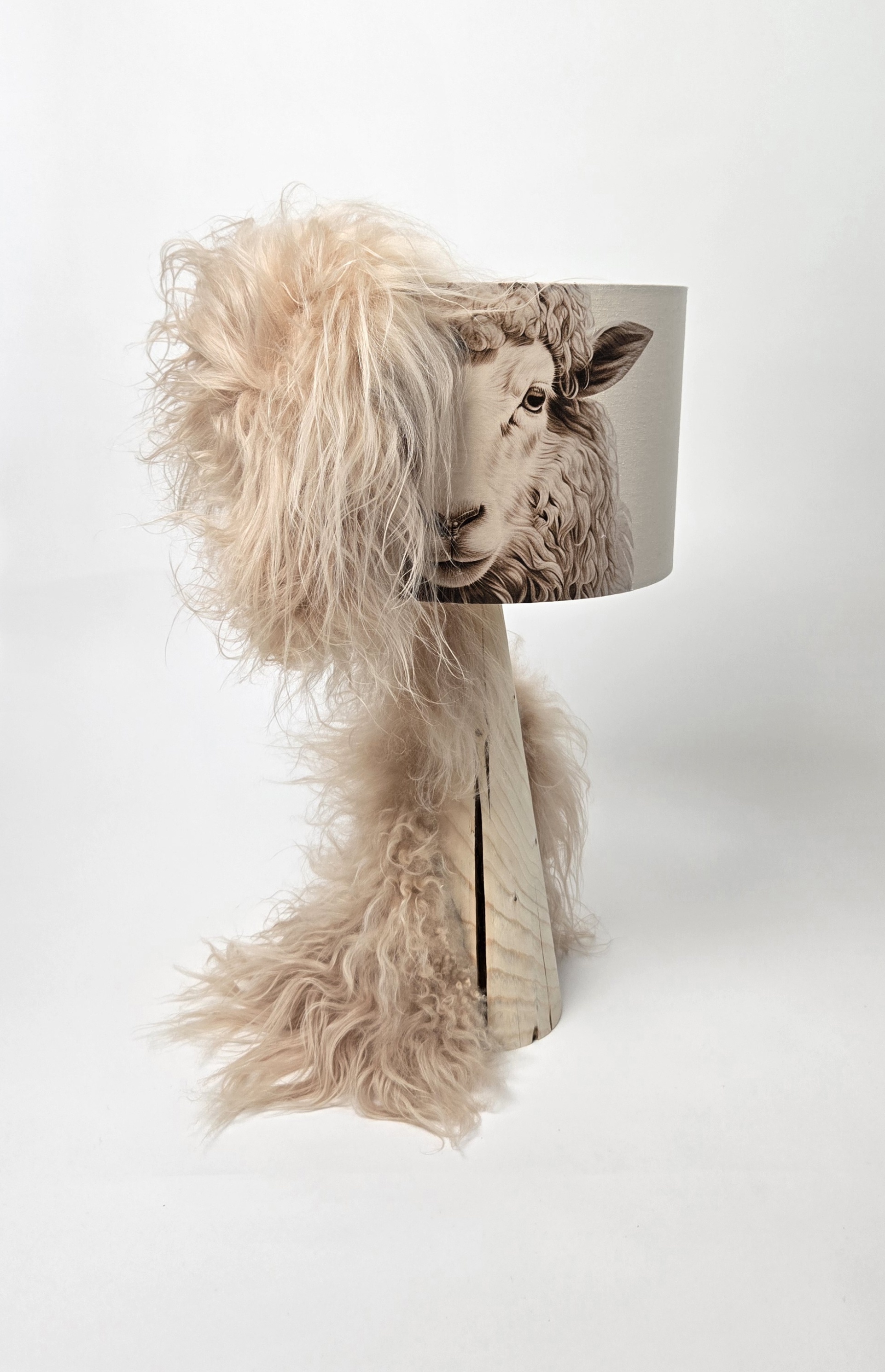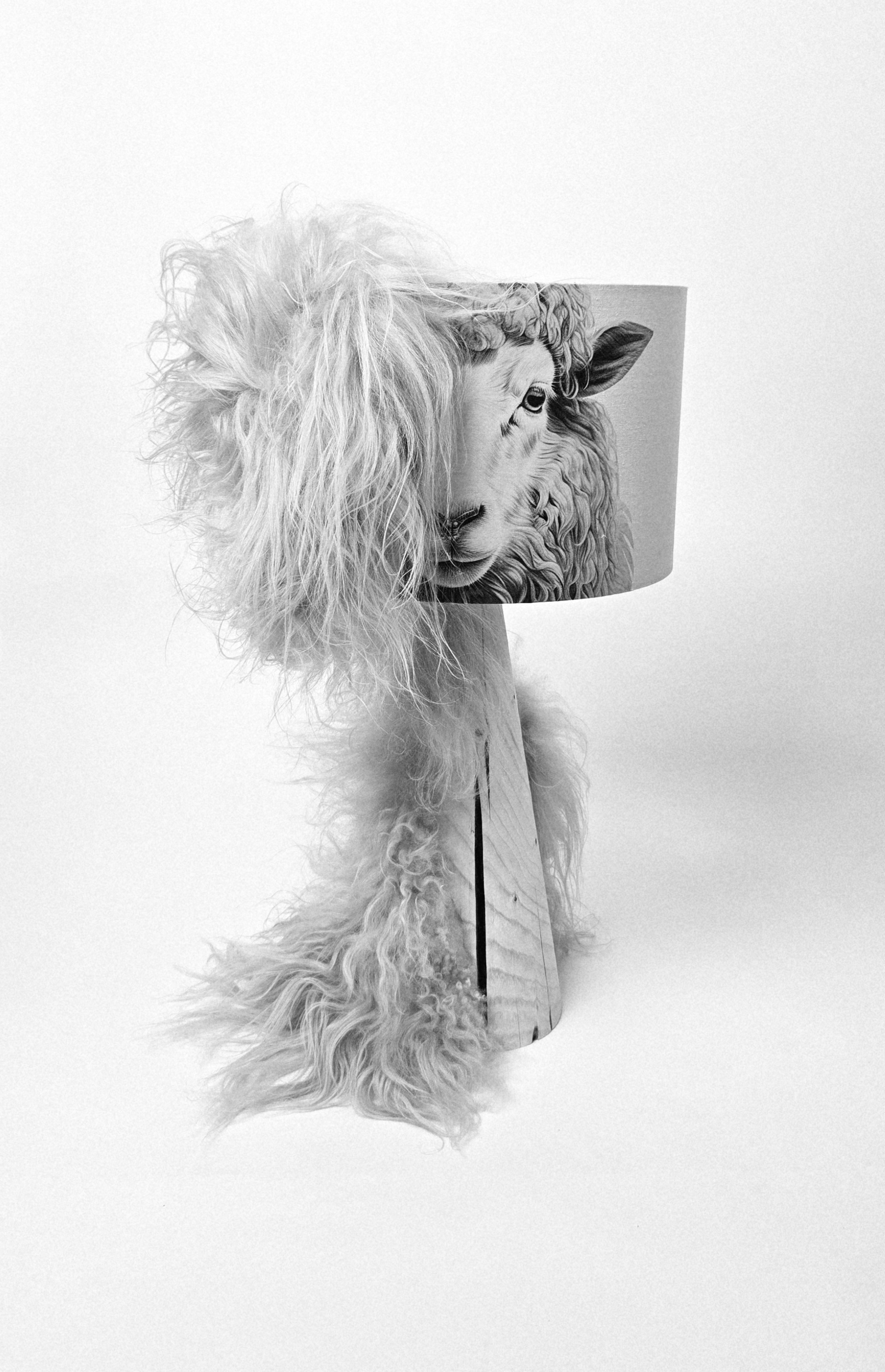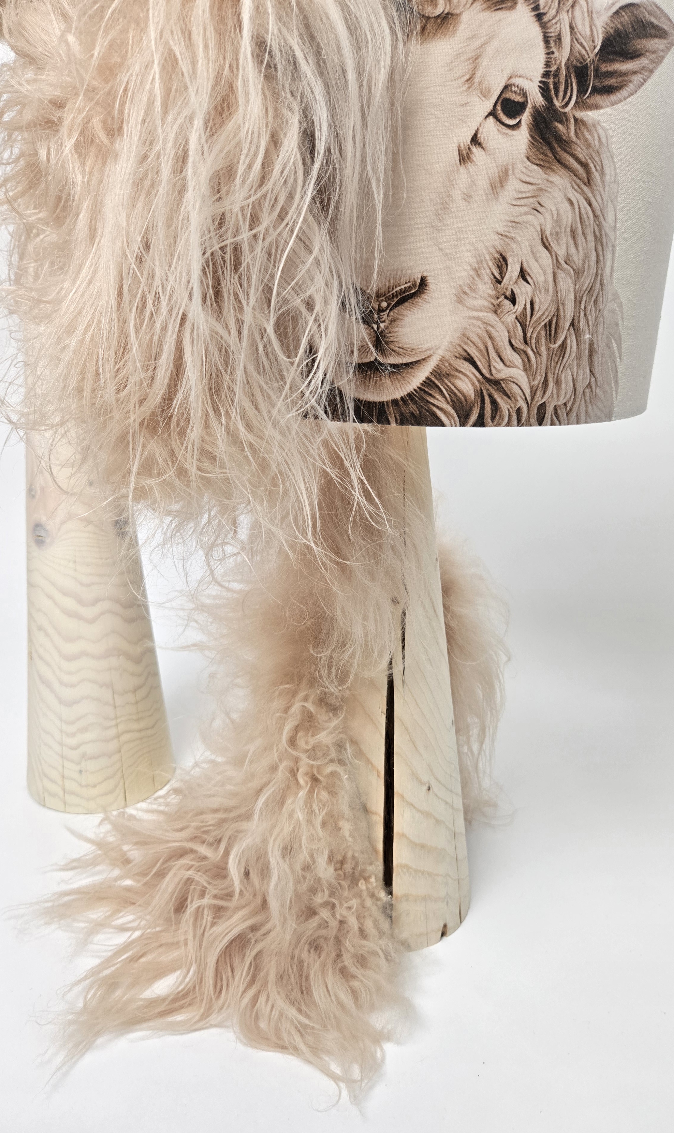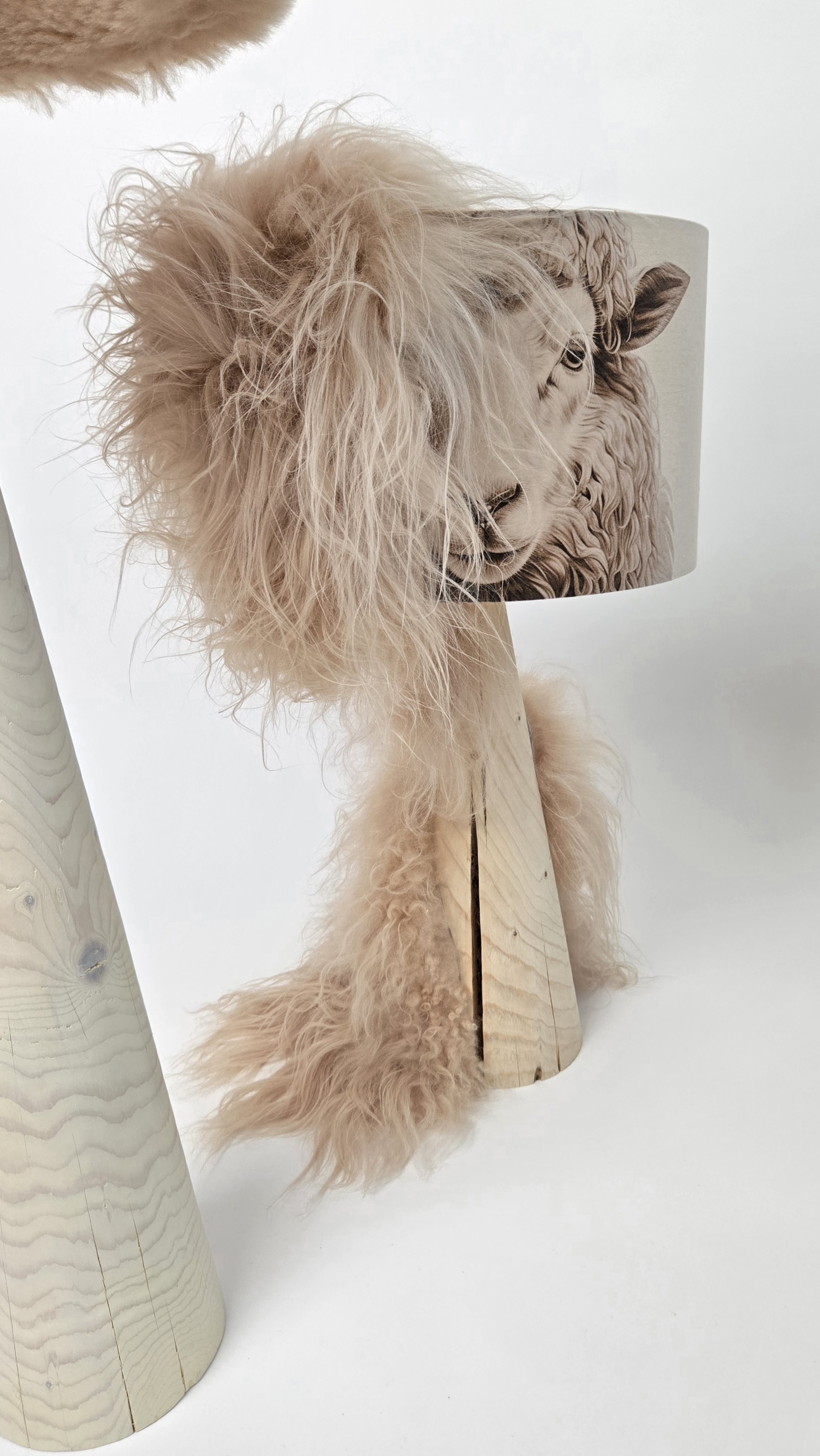 Lampa inspirovaná ovčí srstí a její strukturou, kombinující kůži, textil a dřevo. Nepřehlédnutelný prvek v prostoru.