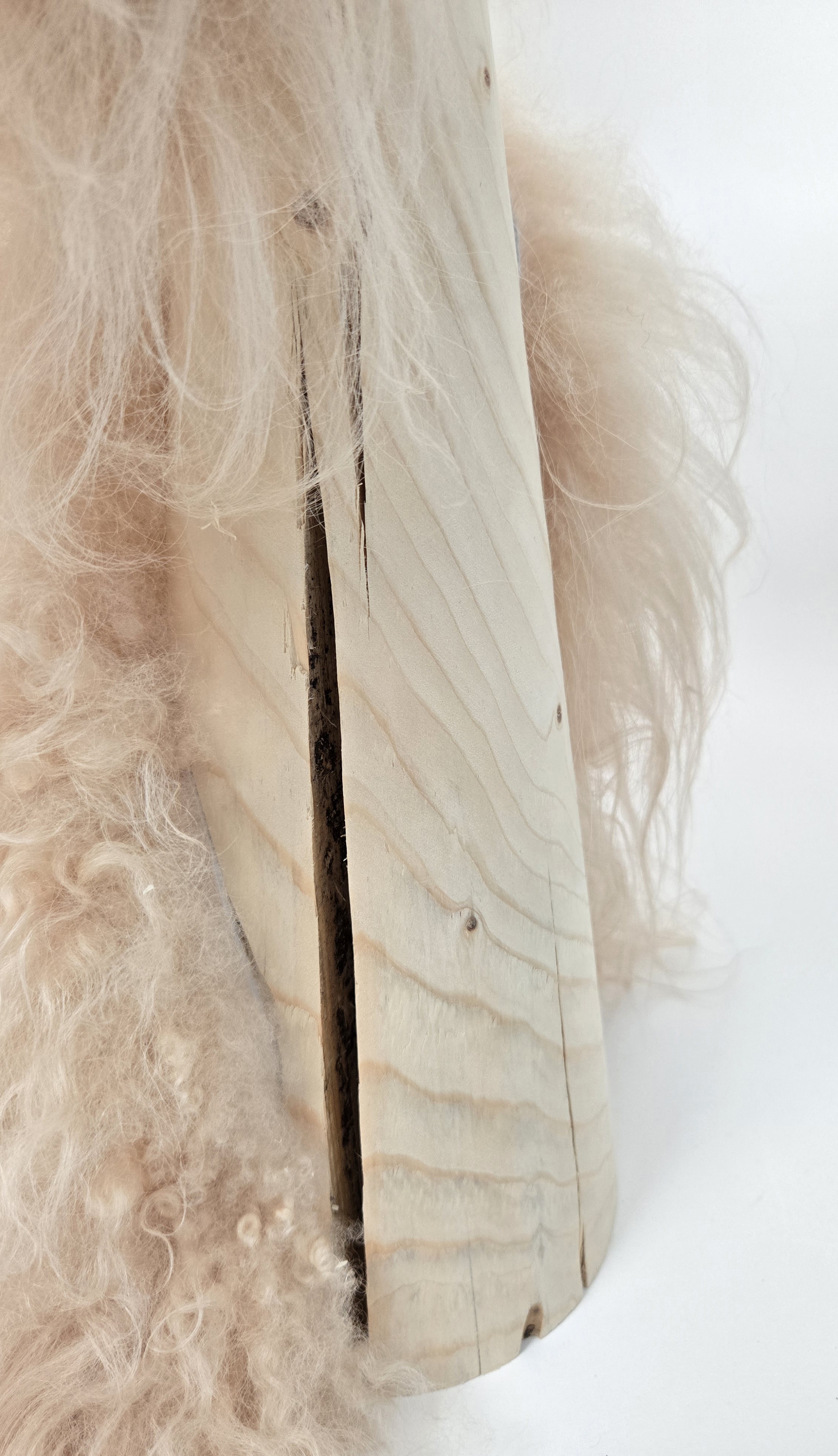 Materiál: Smrkové dřevo, kov, plast, textil, ovčí kůže